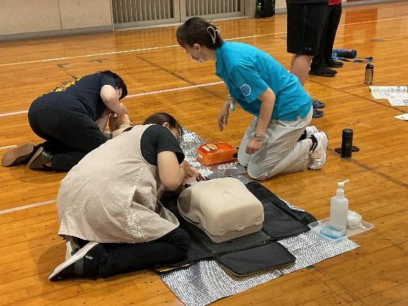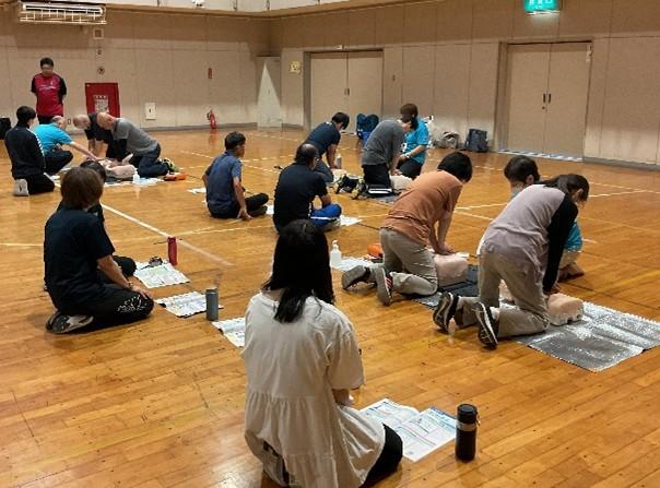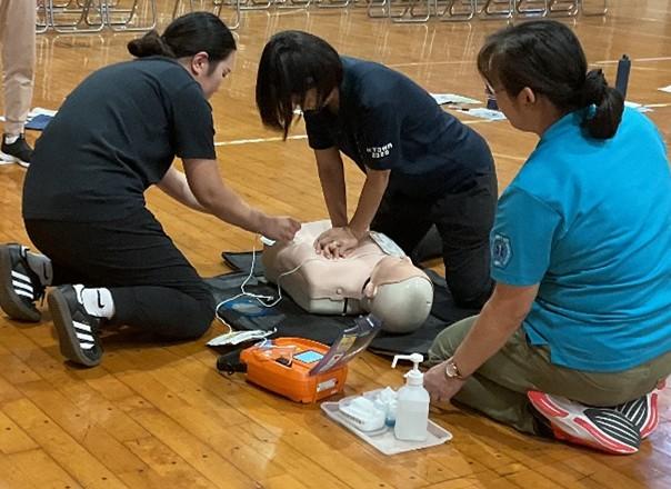 8月の3日間、3グループに分かれ、本校体育館にて教職員対象の心肺蘇生法(AEDを含む)・誤嚥窒息初期対応研修を行いました。